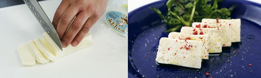 お好みの厚さに切って、フライパンでさっと焼き色をつけて。ホエイが肉汁のようにじわっと滲み出て、食欲をそそります。