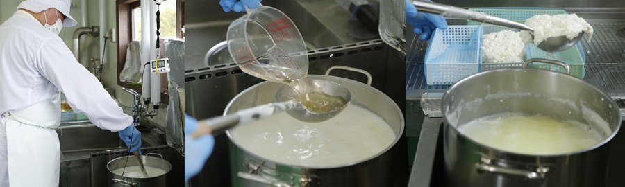 「みるふちゃん」の作り方はとってもシンプル。加熱殺菌した生乳にお酢を加えると、豆腐のような固形分と、ホエイと呼ばれる液体に分離します。固形分を型に入れて、水切りをすればできあがり。シンプルだからこそ、気温や湿度など環境の違いが品質に影響する奥の深さも、牛乳豆腐の特徴といえます。一番の決め手となるのは、やはり牛乳。市販の牛乳を使って各家庭で作ることもできなくはないのですが、「みるふちゃん」は製造者である酪農家の牛舎から運んできた、搾りたての生乳を使っているので、鮮度やコクがひと味もふた味も違います。